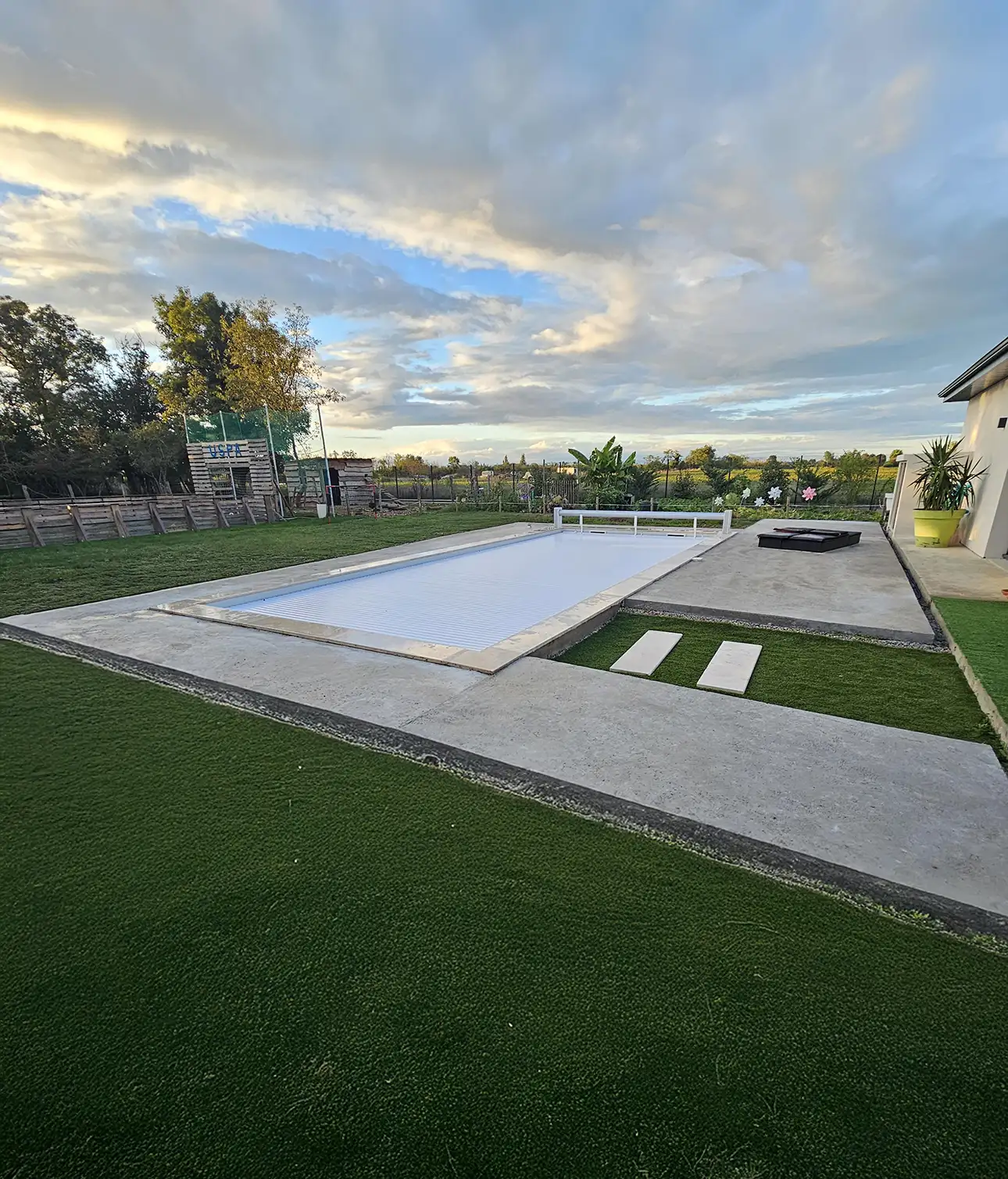 Notre conception prend en compte votre projet dans sa globalité, y compris l'aménagement des abords. Créez un authentique espace de vie extérieur avec notre accompagnement : dallage élégant, plages en bois ou composite, voire intégration d'équipements spécifiques comme douches extérieures ou systèmes d'éclairage pour des soirées estivales parfaites.